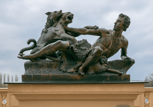 He’s knocked onto his knees. Beast on his back.